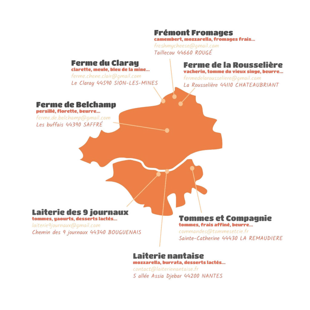Nous sommes un collectif de fermes et entreprises artisanales bio situé.es en Loire Atlantique. Le lait que nous utilisons est produit sur la ferme ou issu d’une seule ferme située à moins de 40km du lieu de transformation. Nous privilégions la commercialisation de nos produits aux circuits courts de nos territoires.